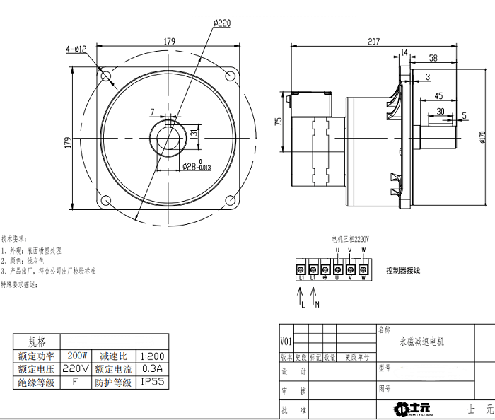 旋轉(zhuǎn)小火鍋電機減速機也叫旋轉(zhuǎn)火鍋減速機,旋轉(zhuǎn)壽司減速電機,200W小型旋轉(zhuǎn)平臺用減速機,餐飲旋轉(zhuǎn)平臺專用無刷電機,旋轉(zhuǎn)小火鍋用電機減速機-士元200W永磁直流電機減速機外形圖如下。
